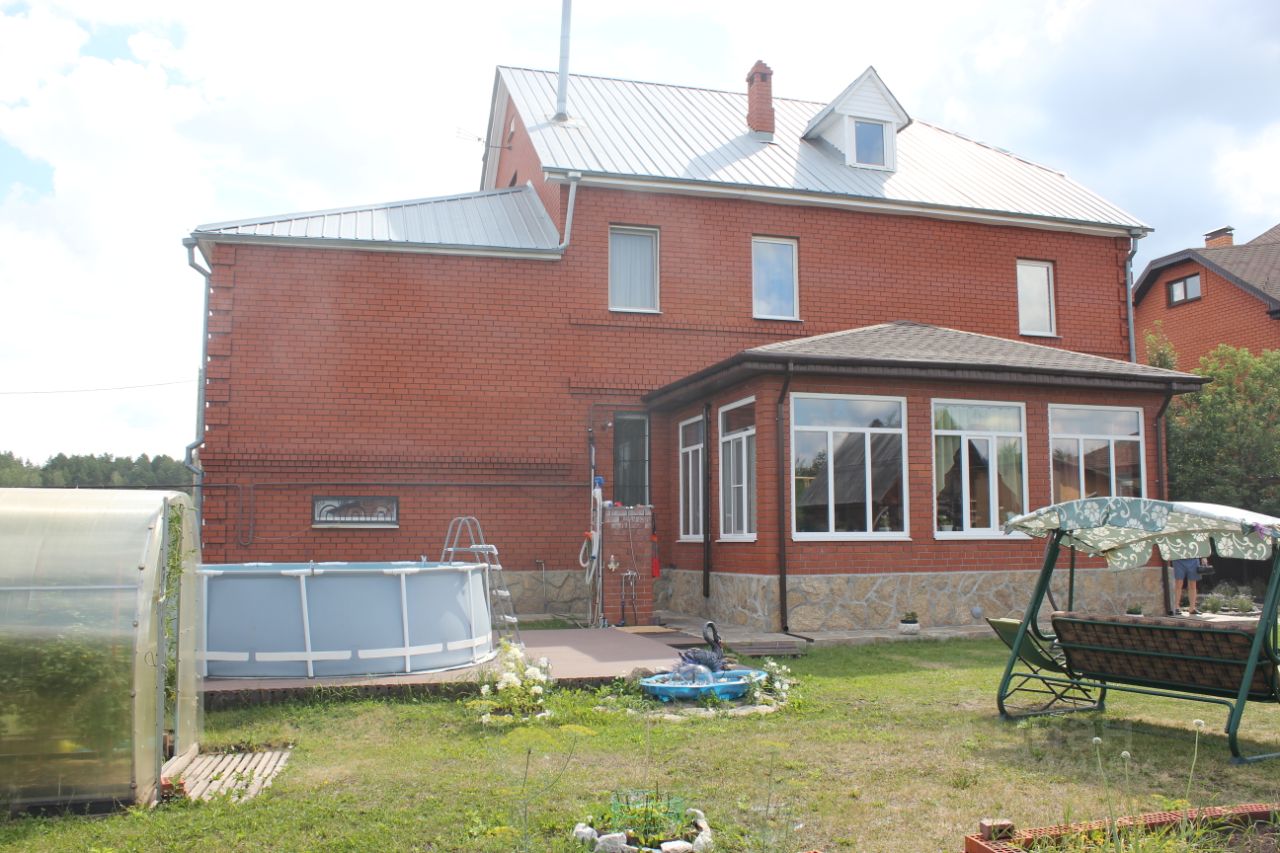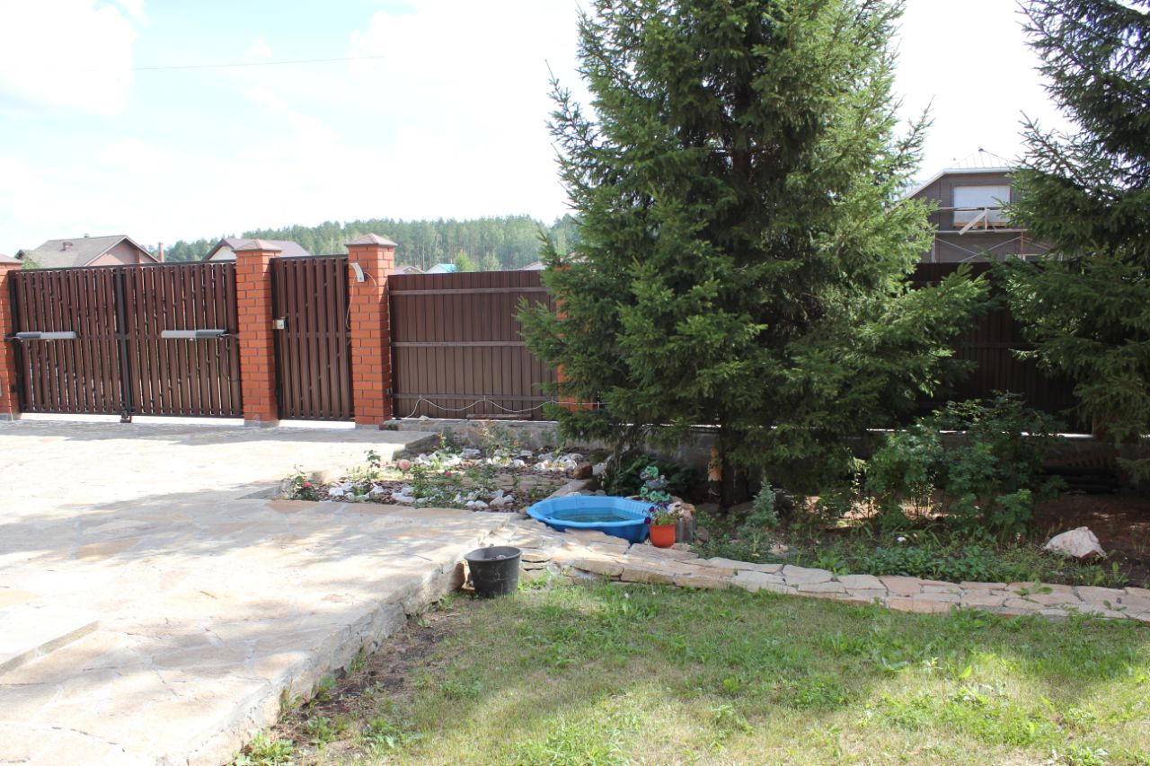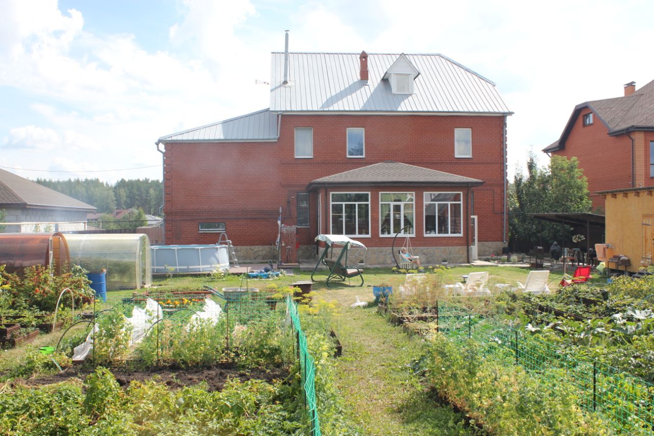 Отличное место жить в своем доме и рядом г. Екатеринбург (расстояние до автовокзала 26 км.) БОЛЬШОЙ и УЮТНЫЙ ДОМ находится пос. Первомайский, Сысертский район и дорога до города занимает не более 12 мин. (Челябинский тракт - освещен, что очень удобно в темное время суток). На территории поселка магазин ''Пятерочка'', частный магазин, аптека, детский сад, клуб, библиотека, школа (ходит автобус в поселок рядом ''Октябрьский'' 2 км.). Дом облицован красным кирпичом, отмостка и территория у дома - камень, территория огорожена забором, ворота автоматические. Газ, электричество - 380 В, 15 кВт, вода - скважина, выгребная яма - 10 куб.м. Гараж на 2 автомобиля - 64 кв.м. 1 этаж: входная группа, тамбур, прихожая -14,2 кв.м., туалет, душевая, зал - 27,4 кв.м., 2 комнаты - 17 и 11 кв.м., кухня -17 кв.м., котельная, кладовая (используется как прачечная), веранда (холодная) - 30 кв.м., где имеется погребок ''Уралец''. Между первым и вторым этажами (над гаражом) комната-зал 49 кв.м с балконом 14 кв.м., 2 этаж: коридор, туалет, 4 комнаты - 28, 20, 20 и 21 кв.м., сауна (комната отдыха - 9 кв.м., душевая - 6 кв.м. и сауна - 3 кв.м.). Мансарда - 59 кв.м. (без отопления). Территория: перед домом 2 ёлки, клумбы, за домом - навес (беседка), поляна для отдыха, площадка под бассейн из доски ДПК размером 5х6, огород: из насаждений - черемуха, 3 яблони, груши, вишня, смородина, малина, жимолость, клубника., 2 маленьких теплицы (огурцы, томаты), грядки, летний полив. Коммунальные платежи в месяц составляют: зимой не более 10 тыс. руб., летом не более 3 тыс. рублей. Реальным покупателям торг.